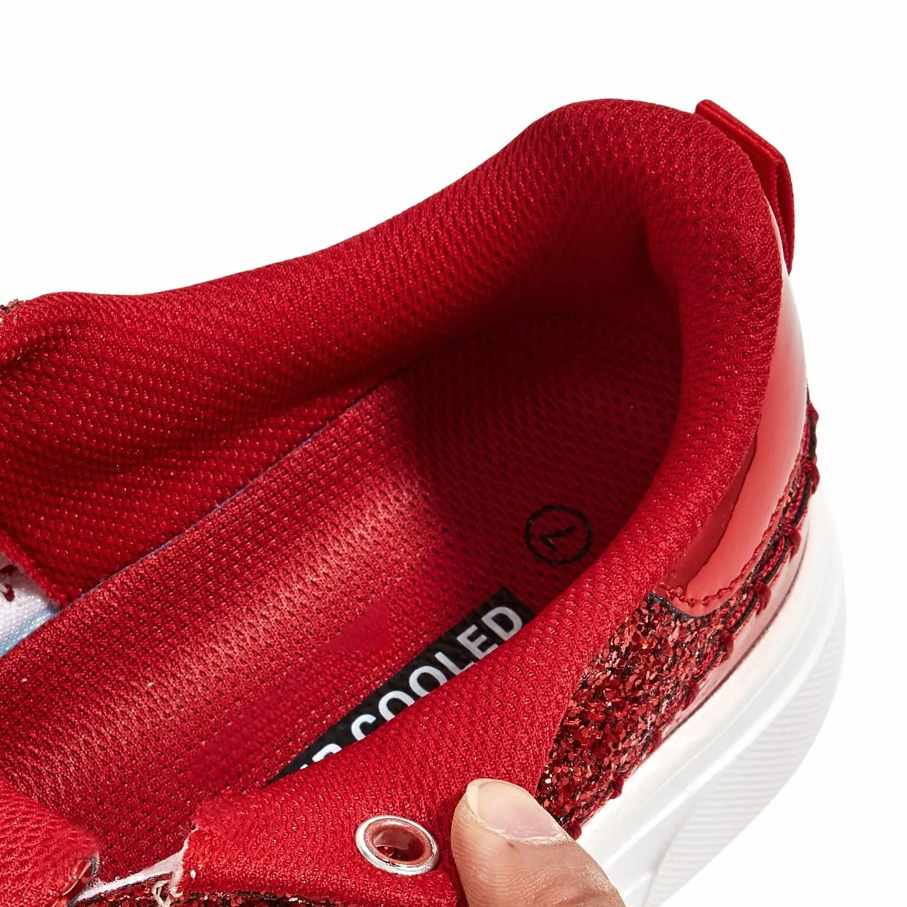 - Upper: Synthetic and fabric material with a red glitter design and a soft textile lining for comfort.
